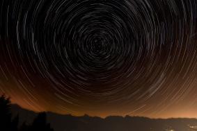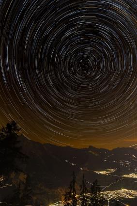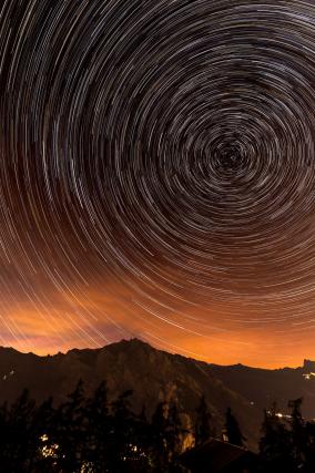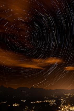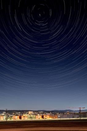 Startrails (Strichspuraufnahmen) sind Langzeitaufnahmen des nächtlichen Himmels bei stehender (nicht nachgeführter) Kamera. Durch die Erdrotation bewegen sich die Sterne scheinbar auf Kreisbahnen um den Himmelspol. Auf der Nordhalbkugel ist der Polarstern (zur Zeit) etwa 0,7 Grad vom nördlichen Himmelspol entfernt.