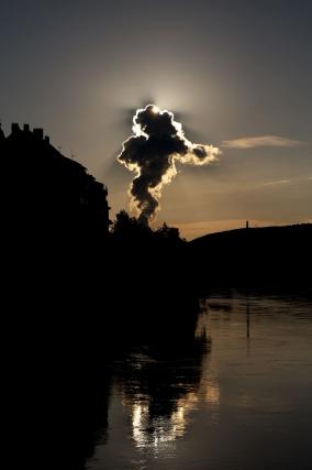 Die Sonne versteckt sich hinter der Kühlwassersäule des AKW
